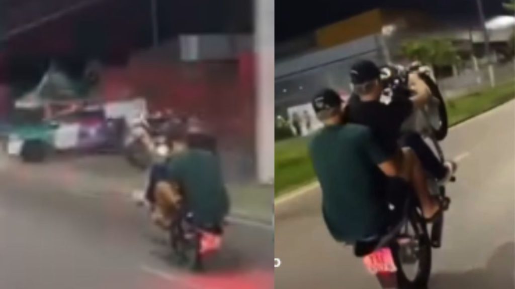 Nas imagens, a dupla aparece empinando o veículo, prática conhecida como “grau”, em um trecho movimentado da via.
