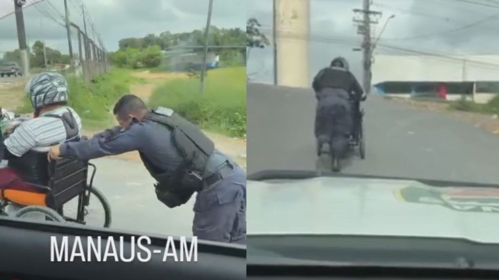 Um vídeo compartilhado nas redes sociais mostra um sargento da Polícia Militar do Amazonas (PMAM), identificado como Ecleidson Araújo, ajudando um cadeirante a subir uma ladeira em Manaus.