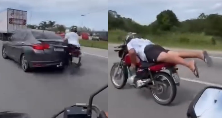 Um motoqueiro foi se exibir na BR-101, em Porto Belo, no Litoral Norte de Santa Catarina, e acabou batendo violentamente num carro nesta terça-feira (6), enquanto uma testemunha filmava a presepada.