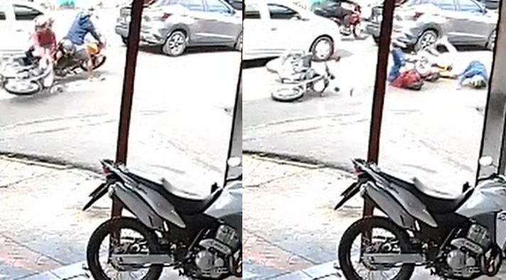 Uma freada de moto, outro moto atrás e um acidente nesta sexta-feira (20), no bairro Compensa, Zona Oeste de Manaus, filmado por uma câmera da loja.