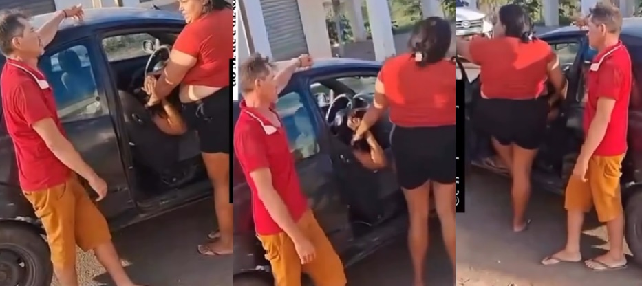 Acabou pegando os dois no carro dele, puxou o cabelo da talarica e ainda deu uns tapas no homem que ela achava ser louco só por ela.