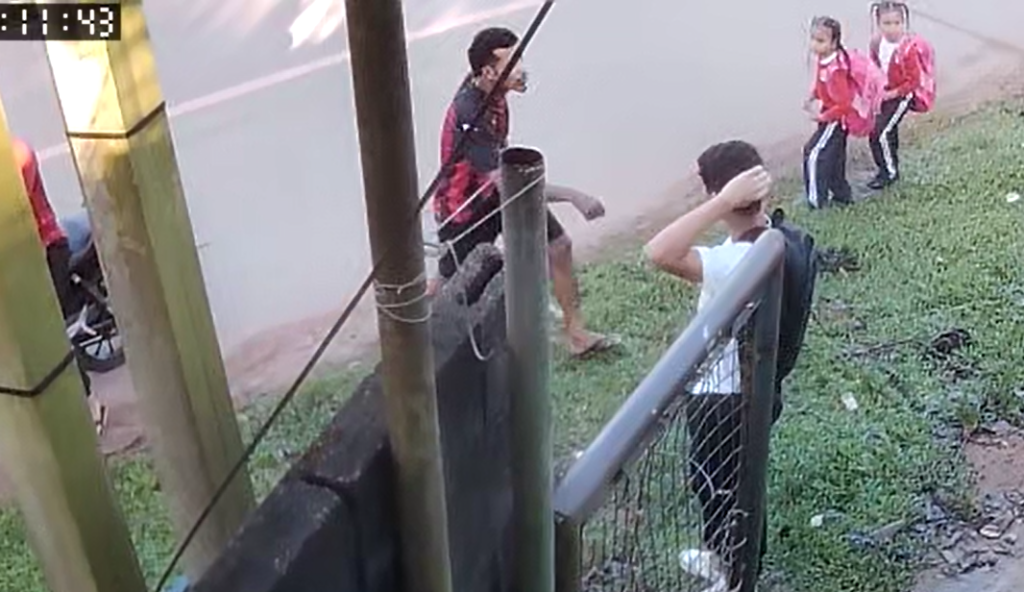 As imagens mostram o momento em que a dupla chega ao ponto. O garupa desce e passa a exigir os celulares de quem está no local. Próximo a um rapaz de mochila, duas crianças, aparentemente com até cinco anos, presenciam toda a abordagem. O jovem é abordado, mas afirma não ter celular.
