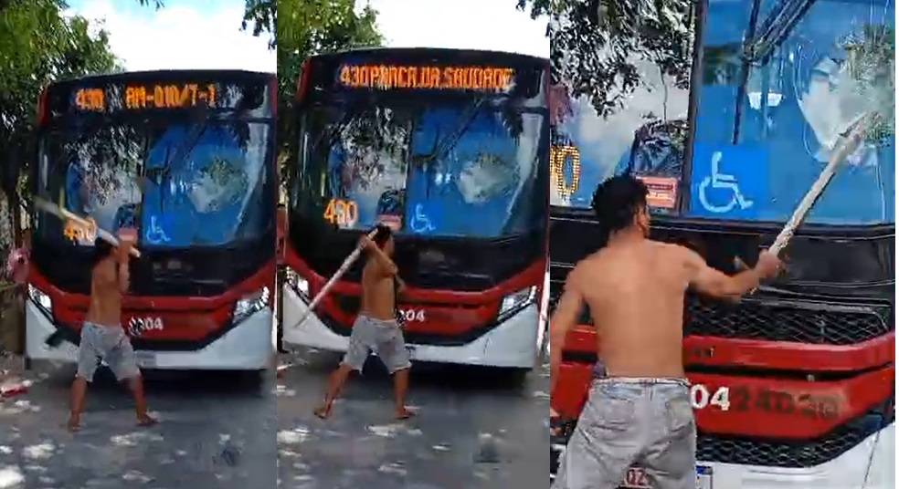Circula neste fim de semana o vídeo de um homem apelidado de “Curupira da Pedra” quebrando um ônibus neste sábado (14), em Manaus.