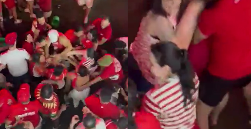Nas imagens, é possível ver as duas se estranhando enquanto outras pessoas tentam apartar a briga. Só que a intervenção, em vez de acalmar, acabou piorando o tumulto ao redor. Formou-se uma grande aglomeração, com muitos gritos e empurra-empurra generalizado.