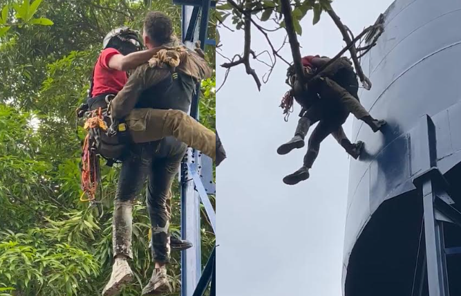 O Corpo de Bombeiros Militar do Amazonas (CBMAM) resgatou dois homens, nesta segunda-feira (29), que estavam presos no alto de uma caixa d’água, a cerca de 20 metros de altura, após se intoxicarem durante a pintura do equipamento, na rua das Pedras, no bairro Tarumã-Açu, Zona Oeste de Manaus.