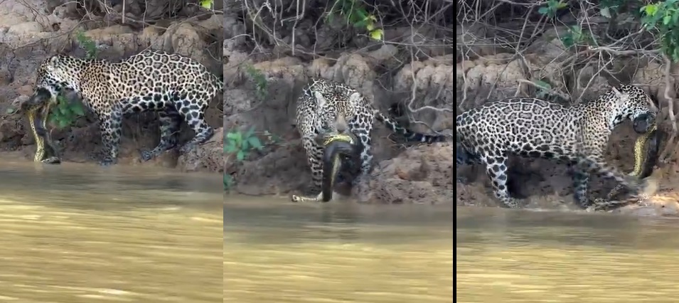 Um guia de turismo gravou uma cena raramente filmada no rio Piquiri, no Pantanal, enquanto levava turistas para um passeio de barco ao Parque Estadual Encontro das Águas.