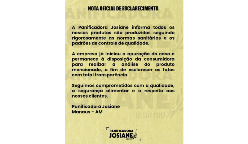 O caso ganhou repercussão nas redes sociais, o que levou a Padaria Josiane a se pronunciar. Em nota, a empresa declarou que segue rigorosamente as normas sanitárias e os padrões de controle de qualidade na produção de seus itens.